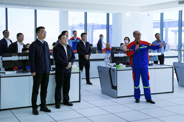 儀式結束后,與會領導還前往自動化集裝箱堆場指揮中心,詳細聽取現場操作講解,并觀摩堆場運營情況。