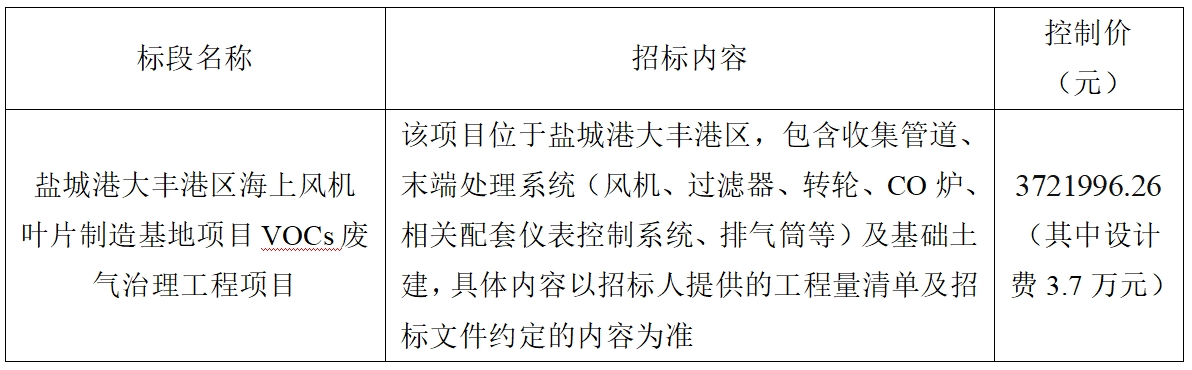 (1)項目名稱:鹽城港大豐港區海上風機葉片制造基地項目VOCs廢氣治理工程項目。