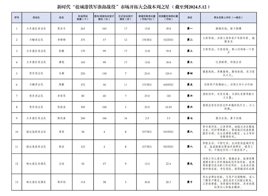 第一名:大豐港區突擊隊 夏迎冬(拜訪客戶263家,簽訂意向協議165份,簽訂正式協議17份,新增貨物吞吐量13.8萬噸,鞏固量貨物吞吐量39.8萬噸);