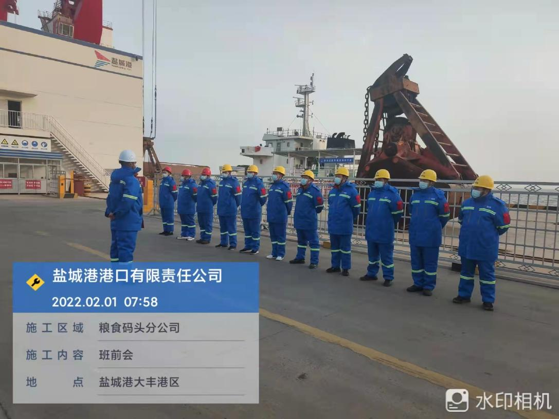 農歷正月初一,鹽城港大豐港區港口公司各子(分)公司在碼頭(作業現場),如往常一樣準點開始作業班前會,進行安全生產、疫情防控工作交底。