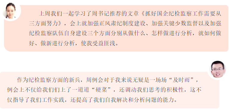 紀檢監察業務周例會是大豐港區提高紀檢條線工作能力的方式,也是建設學習型紀檢干部的有效嘗試。“學習要有干貨,不能搞花架子,要了解我們的干部最需要學什么,緊貼實際需求和工作要求來安排學習內容。”大豐港區紀檢相關負責人表示,深化監察體制改革,對紀檢監察干部的業務能力提出了更高更嚴的要求,學習就是要著力補短板、強弱項,解決紀檢監察干部本領“恐慌”問題。例會上,就集團紀委下發文件精神進行剖析、對日常監督如何抓、信息宣傳選題立意、特色亮點提煉歸納進行培訓。會上還提倡“我的問題大家答”,組織交流討論、現場解答,鼓勵善于發現問題,積極解決問題,創新理念思路,確保可以“充電補能”,提升業務能力。