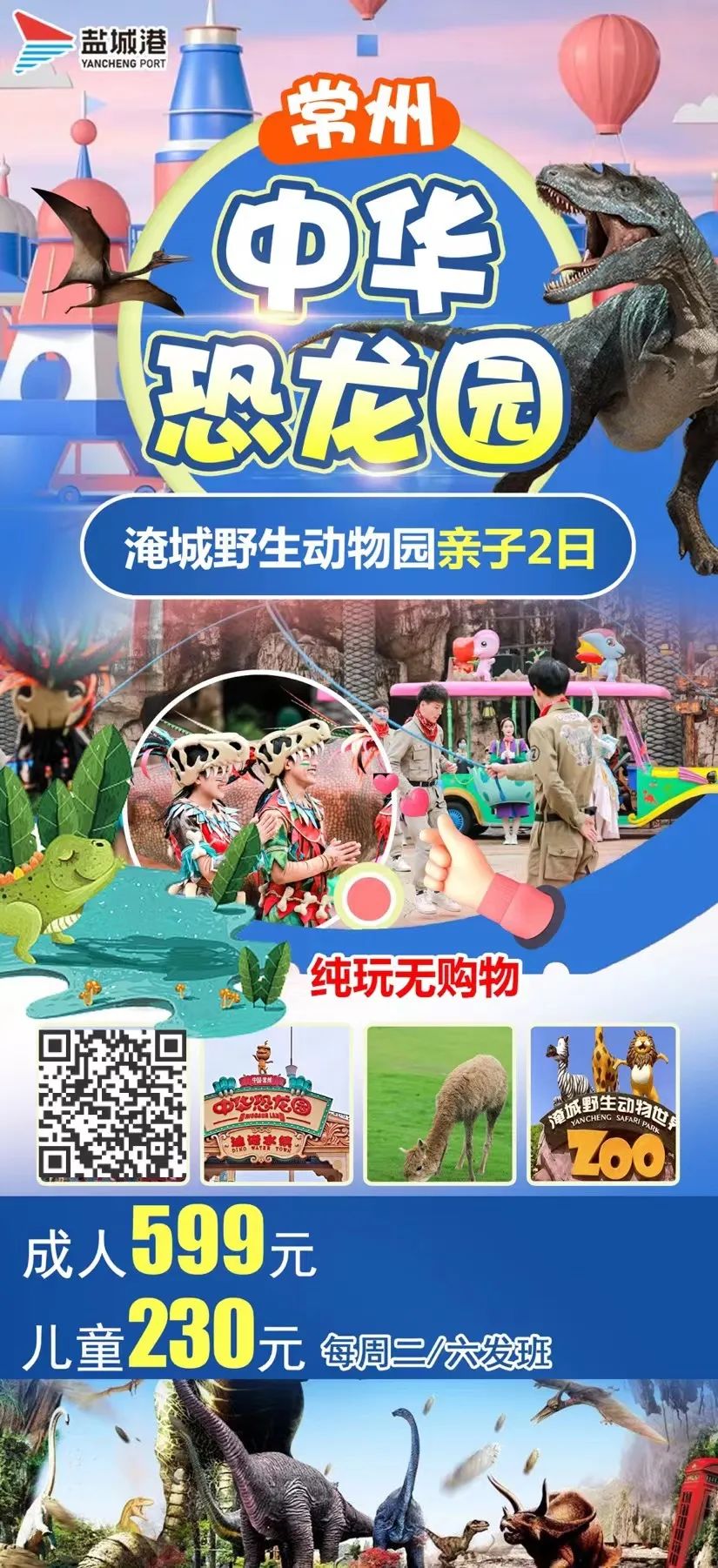 為充分發揮常州、鹽城兩地的旅游優勢,拓展常鹽合作空間和領域,港泊旅行社分公司本周首推常州恐龍園純玩一日游、常州恐龍園淹城動物園親子2日游,超刺激的4D過山車,大海嘯,帶你探索恐龍的神秘家園;還可以近距離接觸200多種10000多頭動物,森林大馬戲等表演,領略一場視覺和聽覺的盛宴。
