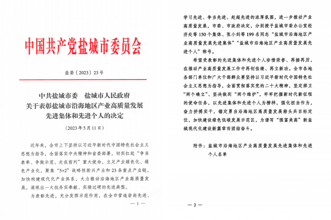 近日,市委、市政府發(fā)布關(guān)于表彰鹽城市沿海地區(qū)產(chǎn)業(yè)高質(zhì)量發(fā)展先進集體和先進個人的決定,集團獲“鹽城市沿海地區(qū)產(chǎn)業(yè)高質(zhì)量發(fā)展先進集體”榮譽稱號。