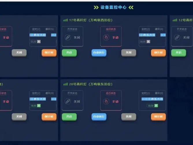 為深入貫徹國家“雙碳”目標(biāo),射陽港區(qū)聚焦節(jié)能降耗、高效運行為抓手,利用4G遠(yuǎn)程模塊聯(lián)動PC端或微信小程序,實現(xiàn)港區(qū)高桿燈照明系統(tǒng)的集中控制管理,根據(jù)生產(chǎn)需求合理開關(guān)作業(yè)區(qū)域高功率燈具,既降低了人工煩瑣操作,又有效降低電力消耗減少能源浪費,延長燈具的使用壽命。據(jù)了解,港區(qū)20桿高桿燈,每日開啟平均約8桿高桿燈,每年可節(jié)約電量103680KWh,節(jié)約電費8萬余元,經(jīng)濟(jì)效益顯著。