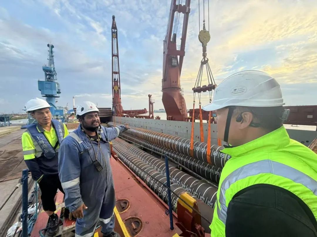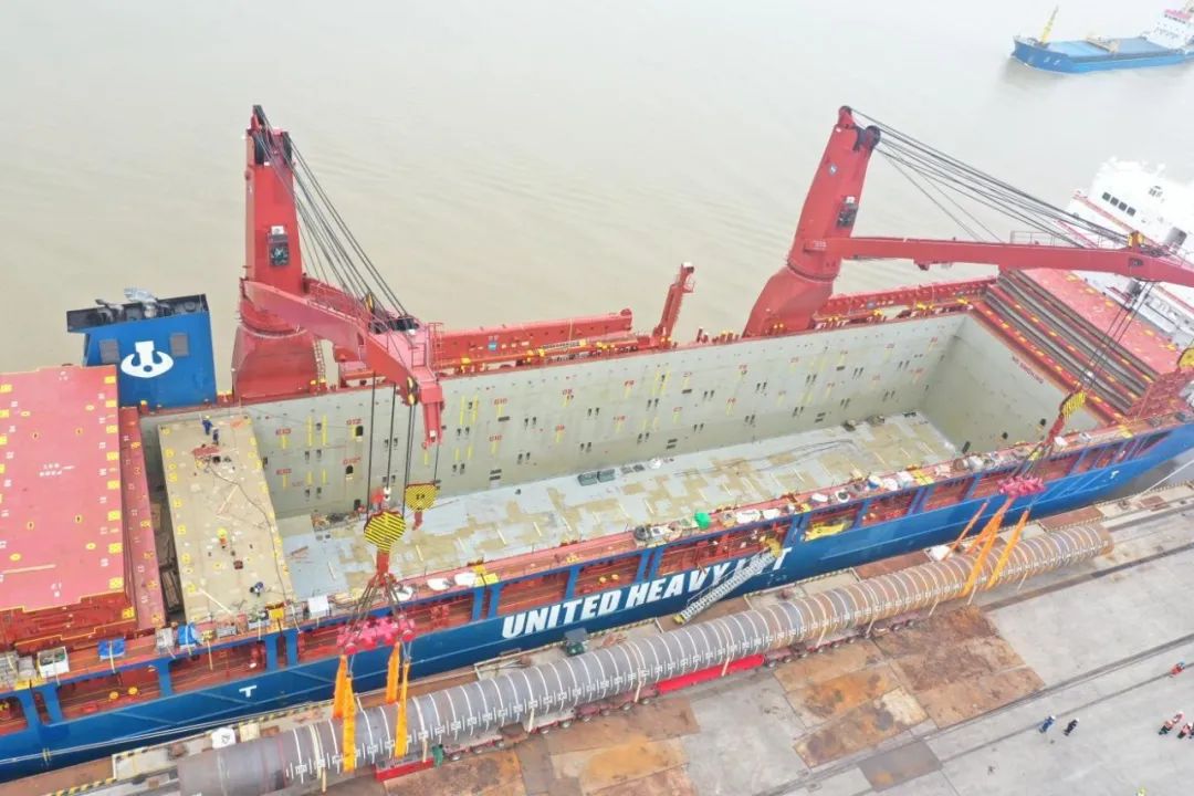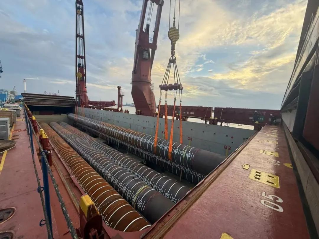 “幸福號(hào)”貨輪承載著江蘇天能海洋重工有限公司精心制造的尖端管樁裝備,這些“大國(guó)重器”將遠(yuǎn)赴中東,為當(dāng)?shù)赜蜌赓Y源開(kāi)發(fā)提供關(guān)鍵基礎(chǔ)設(shè)施支持。全船共裝載45件管樁及配套鋼結(jié)構(gòu),其中管樁長(zhǎng)度普遍超過(guò)40米,最長(zhǎng)達(dá)76.8米,單件最大重量突破377噸,堪稱“海上鋼鐵巨龍”。