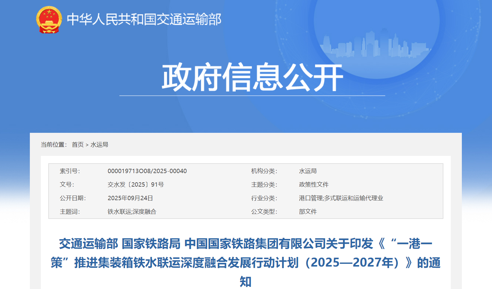 為深入貫徹落實(shí)黨中央、國務(wù)院決策部署,優(yōu)化調(diào)整運(yùn)輸結(jié)構(gòu),進(jìn)一步發(fā)揮綜合運(yùn)輸優(yōu)勢(shì),促進(jìn)有效降低全社會(huì)物流成本,現(xiàn)將《“一港一策”推進(jìn)集裝箱鐵水聯(lián)運(yùn)深度融合發(fā)展行動(dòng)計(jì)劃(2025—2027年)》印發(fā)給你們,請(qǐng)認(rèn)真抓好落實(shí)。